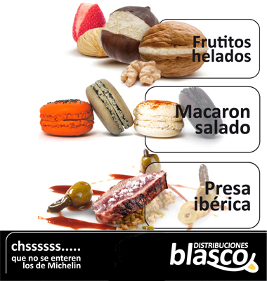 Bajo el lema “chssssss… que no se enteren los de Michelin”, Distribuciones Blasco presenta distintos platos que se preparan en 30 segundos, diferenciando entre entrantes, platos y postres.