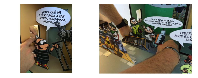 El escaparate consiste en un edificio dibujado a modo de comic, en el que se recrean algunas de las escenas típicas de San Lorenzo con un toque de humor. Cada año intentamos hacer con ellas un guiño cómico a la actualidad oscense. La innovación de este año, es que el edificio ha sido realizado en “3D”, de manera artesanal en el estudio de Veintiocho.