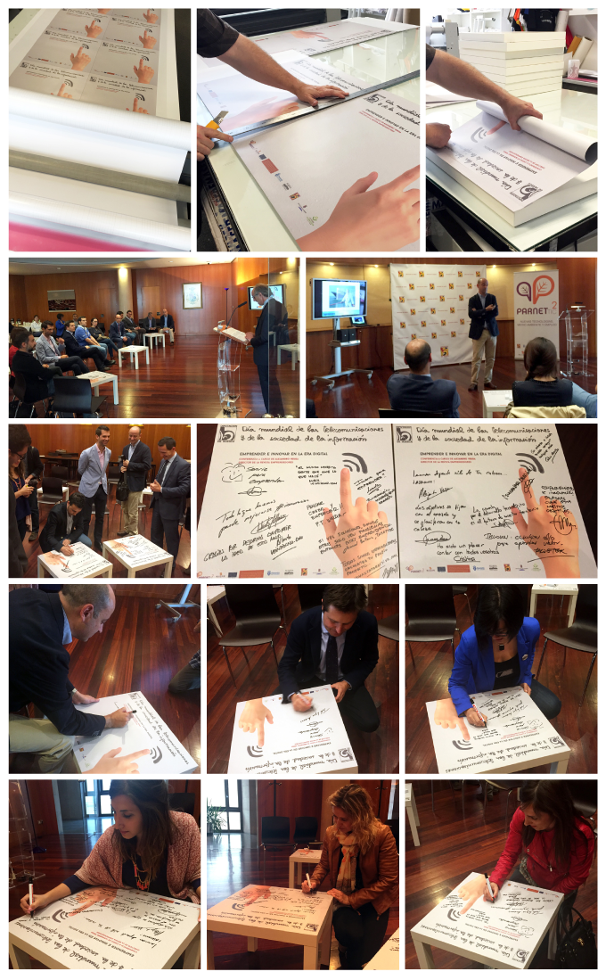 Nos encargamos de la idea, el diseño y la impresión final. ¿Y cual fue el resultado? Preparamos mesas con la imagen diseñada para el acto y al terminar el foro todos los asistentes firmaron en ellas, convirtiéndose las mesas en el libro de firmas de la jornada.