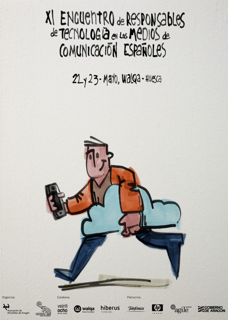 Os mostramos el cartel de la última edición, XI Encuentro de Responsables de Tecnología en los Medios de Comunicación Españoles. Un trabajo de ilustración que representa la dependencia tecnológica que existe hoy en día a través de una imagen que consigue crear simpatía, además de impactar visualmente.