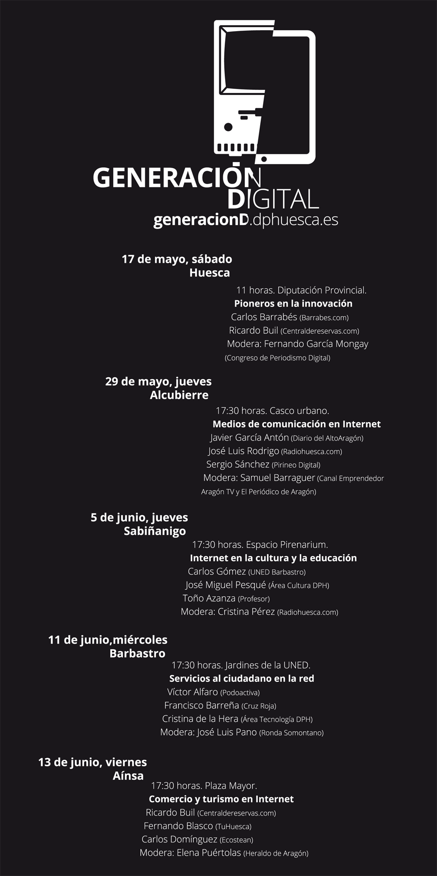 Desde la Diputación de Huesca se ha puesto en marcha la iniciativa Generación Digital, una jornada con un formato diferente que pretende “destacar algunas de las iniciativas más interesantes que se han realizado en los últimos 18 años en la provincia de Huesca y animar, con el ejemplo de quienes lo han conseguido, a que otros inicien actividades vinculadas al mundo digital”, además de reflexionar sobre el futuro de la red en la provincia de Huesca.