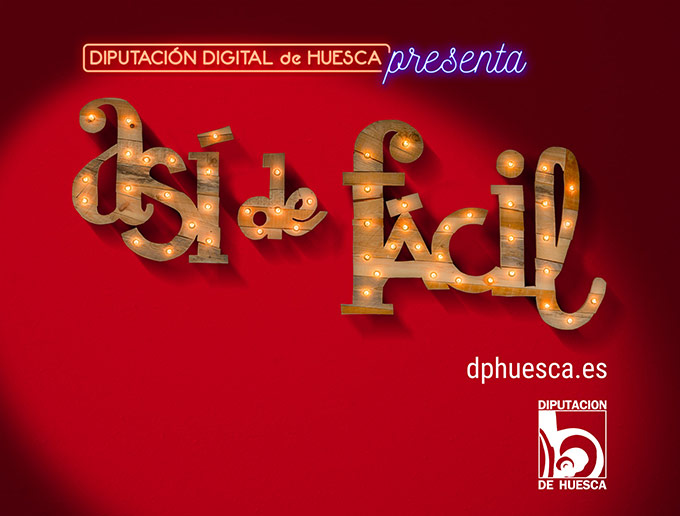 Esta huida digital también está integrada en el método de trabajo para realizar la imagen principal, el claim “ASÍ DE FÁCIL”, haciendo referencia a la sencilla e intuitiva nueva web de la Diputación de Huesca. Hemos creado un rótulo de madera reciclada de palet, elaborado de forma totalmente artesanal con nuestras manos. El guiño espectáculo lo aportan las bombillas que decoran las letras de madera, lo textos de neón que acompañan al rótulo y un fondo de un intenso rojo “telón”, todo esto enmarcado con un efecto de luz puntual que enmarca toda la escena. Una estética diferente, sorprendente, notoria y con una pincelada vintage.